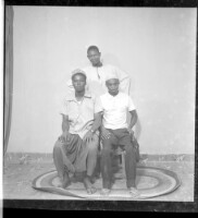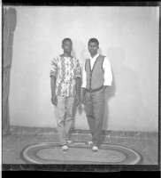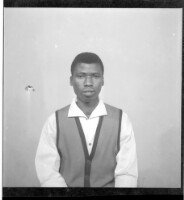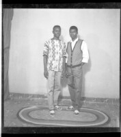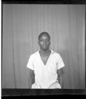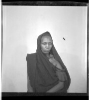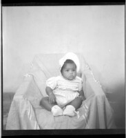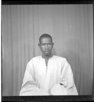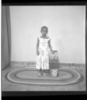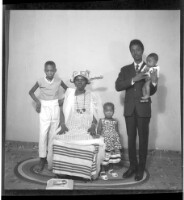 A little girl wearing a dress and pagne standing face-forward in between a woman wearing a dress, pagne, head wrap, and necklace siting face-forward - a boy wearing a t-shirt and pants and a man wearing a suit and tie holding a baby standing in profile be