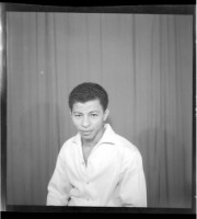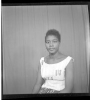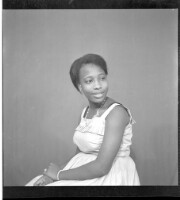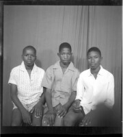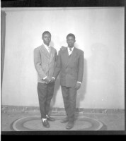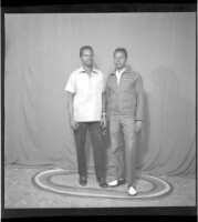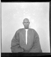 A photo of six men: one wearing a large shirt, pants, and a hat sitting in profile next to a man wearing a boubou sitting face-forward' in front of the other four, three wearing boubous and one wearing a shirt, all standing, two face-forward and two in pr