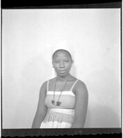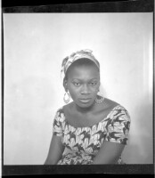 453. EAP449/2/31/453 Reference (shelfmark): EAP449/2/31/453 Title: A girl wearing a dress and head wrap sitting face-forward in the studio. Collection Area: Endangered Archives Programme Languages: Not applicable Date Range: 2nd half od the 20th century Extent: 1 TIFF image