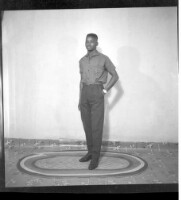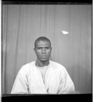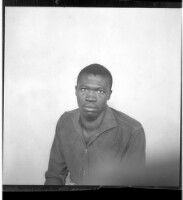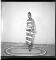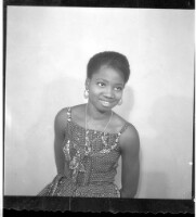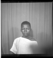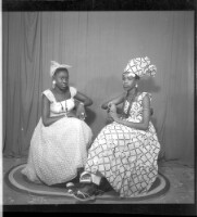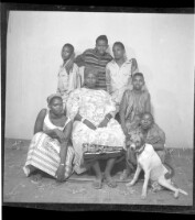 An old woman wearing a dress and head wrap holding a child on her lap sitting in profile in between a woman wearing a dress, head wrap, and necklace standing in profile and a little girl wearing a dress standing face-forward in the studio.