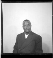 Two women, one wearing a dress and pagne holding a child on her lap sitting face-forward and the other wearing a shirt and skirt sitting in profile in between two men wearing suits and ties standing in profile in the studio.