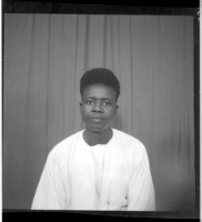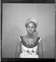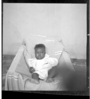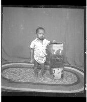 A woman wearing a dress, head wrap, and necklace holding a child on her lap sitting face-forward in between a man and a boy both wearing shirts and pants standing face-forward and in profile in the studio.