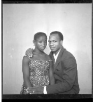 530. EAP449/2/31/530 Reference (shelfmark): EAP449/2/31/530 Title: A man wearing a shirt and shorts next to a girl wearing a dress, head wrap, and necklace standing in profile in the studio. Collection Area: Endangered Archives Programme Languages: Not applicable Date Range: 2nd half od the 20th century Extent: 1 TIFF image