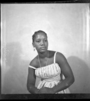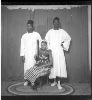 547. EAP449/2/31/547 Reference (shelfmark): EAP449/2/31/547 Title: A girl wearing a dress, pagne, head wrap, and necklace sitting in profile in front of two men wearing boubous standing face-forward in the studio. Collection Area: Endangered Archives Programme Languages: Not applicable Date Range: 2nd half od the 20th century Extent: 1 TIFF image