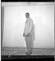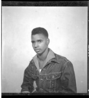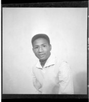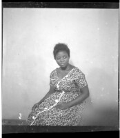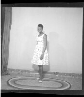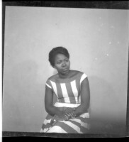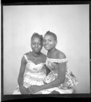 Two young girls, the one on the right wearing a camisole and earrings smiling with her hair styled and the one on the left wearing a camisole, pagnes, and earrings smiling with her hair styled both sitting in profile and holding each other in the studio.