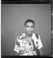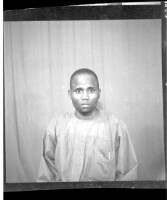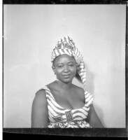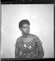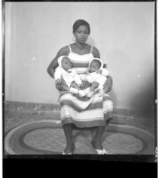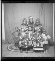 Full shot of seven people, women and children standing and sitting; a little girl standing in a camisole and a woman sitting wearing a fabric dress, headscarf, and necklace with a baby, in the middle a little girl standing wearing a dress and a woman stan