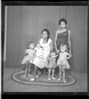 Full shot of two women and four children, all with light skin, on the right a little girl standing wearing a dress and a woman sitting wearing a white dress with a baby in all white, a woman standing wearing a black dress and hairstyle with two little gir