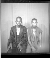 Two men sitting, on the right wearing a white boubou with amulets on his right arm and on the left a man sitting wearing a black boubou and watch in the studio.