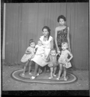 Full shot of a family, a woman wearing a camisole and white skirt and hairstyle and earrings, smiling with a baby in a white dress, on the right a little girl standing wearing a dress, hairstyle, on the left two little girls wearing dresses and hairstyles