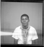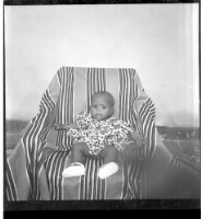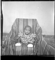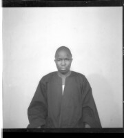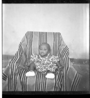 Full shot of a family, all sitting in chairs on a rug, on the right a man sitting wearing a white boubou and black hat with a little boy in a dress shirt and a woman in a dress and headscarf with arms crossed, a watch, and a necklace in the studio.