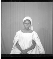 715. EAP449/2/31/715 Reference (shelfmark): EAP449/2/31/715 Title: A woman sitting wearing a white boubou and white headscarf with arms crossed in the studio. Collection Area: Endangered Archives Programme Languages: Not applicable Date Range: 2nd half od the 20th century Extent: 1 TIFF image