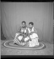 717. EAP449/2/31/717 Reference (shelfmark): EAP449/2/31/717 Title: Full shot of two young girls kneeling on a rug, on the right wearing a dress and necklace and headscarf and on the left wearing a dress and earrings and hairstyle in the studio. Collection Area: Endangered Archives Programme Languages: Not applicable Date Range: 2nd half od the 20th century Extent: 1 TIFF image