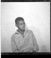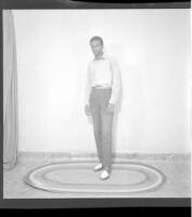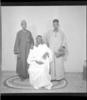 Full shot of three men standing and sitting on a rug, on the right a man standing wearing a black boubou and brown Fez and watch, a young man in the middle wearing a white boubou and watch, and on the left a man standing wearing a brown boubou, black hat,