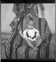 Full shot of three young girls standing and sitting on a rug, on the right a young girl standing wearing a brown camisole and skirt and hairstyle, her arms on a woman in the middle sitting in a chair in a white camisole and pagne and skirt, with a hairsty