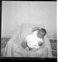 75. EAP449/2/31/75 Reference (shelfmark): EAP449/2/31/75 Title: A baby wearing undergarments sitting face-forward on a chair putting his hand on his head in the studio. Collection Area: Endangered Archives Programme Languages: Not applicable Date Range: 2nd half od the 20th century Extent: 1 TIFF image