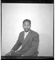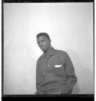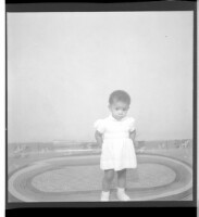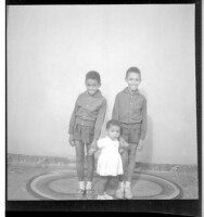 A little girl in a t-shirt sitting facing forward in front of two boys in dress shirts and shorts standing facing forward' and a little girl in a t-shirt and shorts standing in profile in the studio.