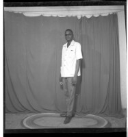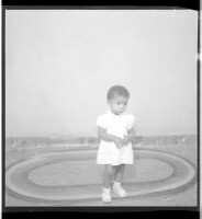 A little girl in a t-shirt sitting facing forward in front of two boys in shirts and shorts, both standing, one facing forward and one in profile, and a little girl in a t-shirt and shorts standing facing forward in the studio.