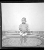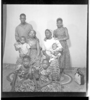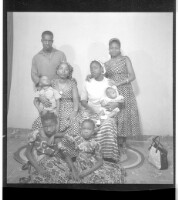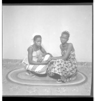 Two little girls in dresses sitting facing forward in front of two women, one in a dress, headscarf and necklace sitting facing forward next to the other in a sweater and pagne and headscarf sitting in profile, both holding children on their laps in front
