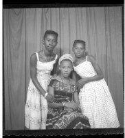 162. EAP449/2/32/162 Reference (shelfmark): EAP449/2/32/162 Title: A girl in a dress, headscarf, and necklace sitting facing forward in front of two girls in dresses standing in profile in the studio. Collection Area: Endangered Archives Programme Languages: Not applicable Date Range: 2nd half od the 20th century Extent: 1 TIFF image