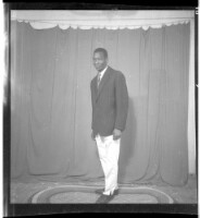 163. EAP449/2/32/163 Reference (shelfmark): EAP449/2/32/163 Title: A man in a jacket and tie and pants standing in profile in the studio. Collection Area: Endangered Archives Programme Languages: Not applicable Date Range: 2nd half od the 20th century Extent: 1 TIFF image