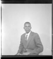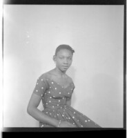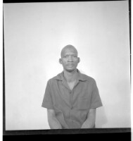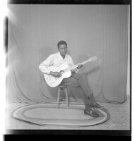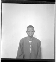 Three boys in dress shirts and pants, one wearing a hat, holding a toy gun in his hand' another boy holding a tennis ball, all standing, one facing forward and two in profile in the studio.