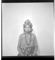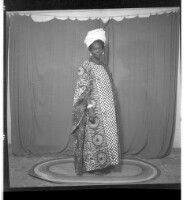 A woman in a dress and headscarf sitting in profile holding a baby on her lap in front of a man in a boubou and hat and a woman in a dress and headscarf standing in profile in the studio.