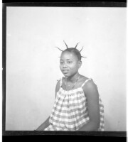 248. EAP449/2/32/248 Reference (shelfmark): EAP449/2/32/248 Title: A girl in a dress, headscarf, and necklace sitting facing forward in the studio. Collection Area: Endangered Archives Programme Languages: Not applicable Date Range: 2nd half od the 20th century Extent: 1 TIFF image