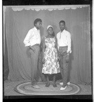 257. EAP449/2/32/257 Reference (shelfmark): EAP449/2/32/257 Title: A girl in a dress and headscarf standing facing forward in the studio between two men in dress shirts and pants, both standing, one facing forward and the other in profile. Collection Area: Endangered Archives Programme Languages: Not applicable Date Range: 2nd half od the 20th century Extent: 1 TIFF image