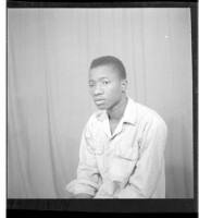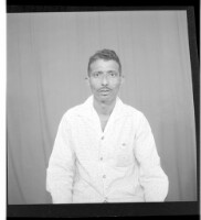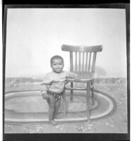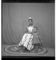 A man in a dress shirt sitting facing forward in front of a girl in a dress, headscarf, and necklaces standing facing forward holding the neck of a man in the studio.