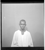 A woman in a dress, headscarf, and necklace sitting in profile in front of a man in a boubou and hat standing in profile holding the neck of a woman in the studio.