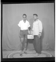 Two men in dress shirts, one in shorts and glasses standing facing forward and the other in large pants standing profile, both holding a radio in the middle of them in the studio.