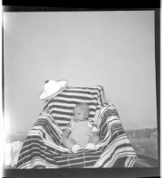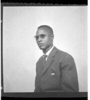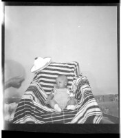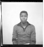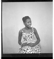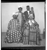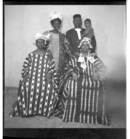 Two women in dresses and headscarves, one wearing a necklace and dollar bills from that time. All sitting facing forward in front of a man in a boubou and hat holding a little boy in his hand next to a woman in a dress and headscarf standing facing forwa