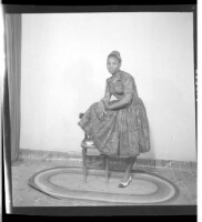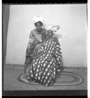 Two women in dresses and headscarves, one sitting in profile in front of the other bent over facing forward holding the neck of the other in the studio.