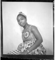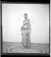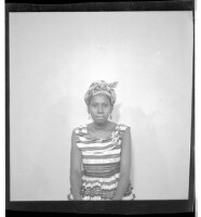 361. EAP449/2/32/361 Reference (shelfmark): EAP449/2/32/361 Title: A girl in a dress, pagne, and headscarf and necklace standing in profile in the studio. Collection Area: Endangered Archives Programme Languages: Not applicable Date Range: 2nd half od the 20th century Extent: 1 TIFF image