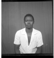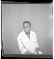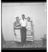 371. EAP449/2/32/371 Reference (shelfmark): EAP449/2/32/371 Title: A man in a dress shirt and pants standing facing forward between two girls in dresses and pagnes and headscarves standing in profile in the studio. Collection Area: Endangered Archives Programme Languages: Not applicable Date Range: 2nd half od the 20th century Extent: 1 TIFF image