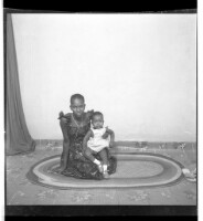 372. EAP449/2/32/372 Reference (shelfmark): EAP449/2/32/372 Title: A woman in a dress and necklace sitting facing forward holding a child on her lap in the studio. Collection Area: Endangered Archives Programme Languages: Not applicable Date Range: 2nd half od the 20th century Extent: 1 TIFF image