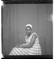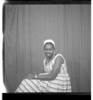 443. EAP449/2/32/443 Reference (shelfmark): EAP449/2/32/443 Title: A woman in a dress, headscarf, and necklace sitting facing forward in the studio. Collection Area: Endangered Archives Programme Languages: Not applicable Date Range: 2nd half od the 20th century Extent: 1 TIFF image
