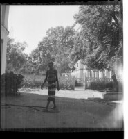 447. EAP449/2/32/447 Reference (shelfmark): EAP449/2/32/447 Title: A girl in a dress, pagne, and headscarf standing in profile walking towards a house in front of a structure and trees. Collection Area: Endangered Archives Programme Languages: Not applicable Date Range: 2nd half od the 20th century Extent: 1 TIFF image