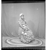 523. EAP449/2/32/523 Reference (shelfmark): EAP449/2/32/523 Title: A woman in a dress, headscarf, and necklace sitting in profile holding a child on her lap in the studio. Collection Area: Endangered Archives Programme Languages: Not applicable Date Range: 2nd half od the 20th century Extent: 1 TIFF image