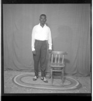 530. EAP449/2/32/530 Reference (shelfmark): EAP449/2/32/530 Title: A man in a dress shirt and pants standing facing forward with his hand on a chair in the studio. Collection Area: Endangered Archives Programme Languages: Not applicable Date Range: 2nd half od the 20th century Extent: 1 TIFF image