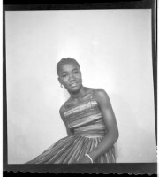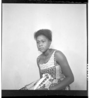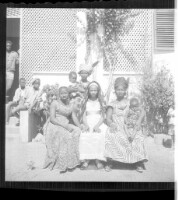 Three women in dresses and headscarves, two wearing necklaces, all sitting facing forward' one holding a child on her lap in front of a woman in a dress, headscarf, and necklace holding a child in her arms standing facing forward' all in front of three bo