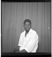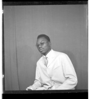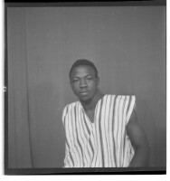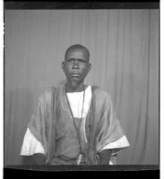 A man in a boubou standing facing forward next to a woman in a dress and headscarf sitting facing forward next to a little girl in a dress and shorts holding a purse standing in profile in the studio.