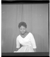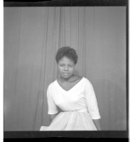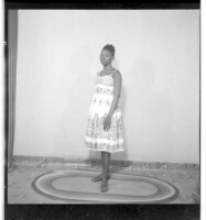616. EAP449/2/32/616 Reference (shelfmark): EAP449/2/32/616 Title: A girl in a dress and necklace standing in profile in the studio. Collection Area: Endangered Archives Programme Languages: Not applicable Date Range: 2nd half od the 20th century Extent: 1 TIFF image