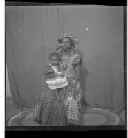 711. EAP449/2/32/711 Reference (shelfmark): EAP449/2/32/711 Title: A woman in a dress, headscarf, and necklace sitting facing forward holding a little girl on her lap in the studio. Collection Area: Endangered Archives Programme Languages: Not applicable Date Range: 2nd half od the 20th century Extent: 1 TIFF image
