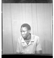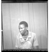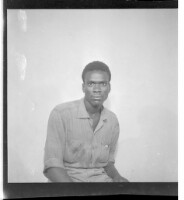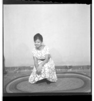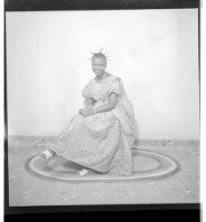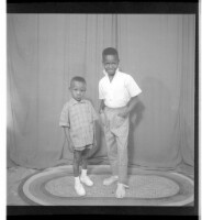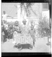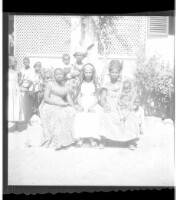 Three women in dresses and headscarves, two wearing necklaces, all sitting facing forward' holding a child on her lap in front of a woman in a dress, headscarf, and necklace holding a child in her arms standing facing forward' all in front of three boys i