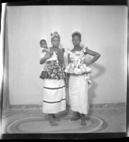 92. EAP449/2/33/92 Reference (shelfmark): EAP449/2/33/92 Title: Two women wearing dresses and pagnes standing face-forward with a baby in the studio. Collection Area: Endangered Archives Programme Languages: Not applicable Date Range: 2nd half od the 20th century Extent: 1 TIFF image