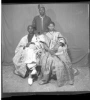 97. EAP449/2/33/97 Reference (shelfmark): EAP449/2/33/97 Title: Three men, two in large boubous sitting face-forward, and the other wearing a boubou and hat, standing face-forward behind them in the studio. Collection Area: Endangered Archives Programme Languages: Not applicable Date Range: 2nd half od the 20th century Extent: 1 TIFF image