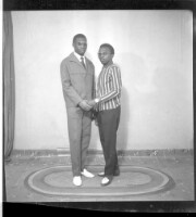 98. EAP449/2/33/98 Reference (shelfmark): EAP449/2/33/98 Title: Two men, one wearing a jacket, pants, and glasses, the other wearing a t-shirt, pants, and glasses, standing in profile in the studio. Collection Area: Endangered Archives Programme Languages: Not applicable Date Range: 2nd half od the 20th century Extent: 1 TIFF image