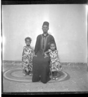 107. EAP449/2/33/107 Reference (shelfmark): EAP449/2/33/107 Title: A man wearing a black boubou and hat sitting face-forward, and two children standing face-forward on either side of him in the studio. Collection Area: Endangered Archives Programme Languages: Not applicable Date Range: 2nd half od the 20th century Extent: 1 TIFF image