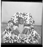202. EAP449/2/33/202 Reference (shelfmark): EAP449/2/33/202 Title: Full shot of a baby sitting in a chair covered by a pagne, smiling and facing forward in the studio. Collection Area: Endangered Archives Programme Languages: Not applicable Date Range: 2nd half od the 20th century Extent: 1 TIFF image